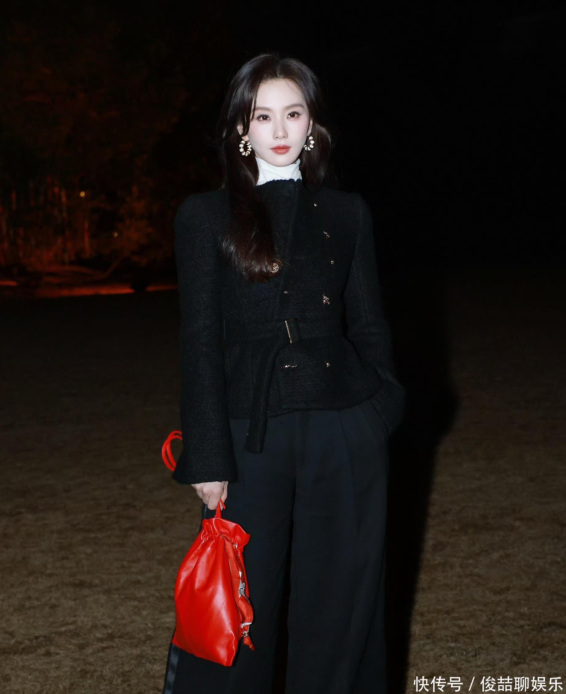不得不说,刘诗诗的气质确实突出,虽然只是穿着一身简单黑色套装,但看着就很贵气,手上红色的包袋更是点睛之笔,红与黑的碰撞,真的是太让人惊艳了。