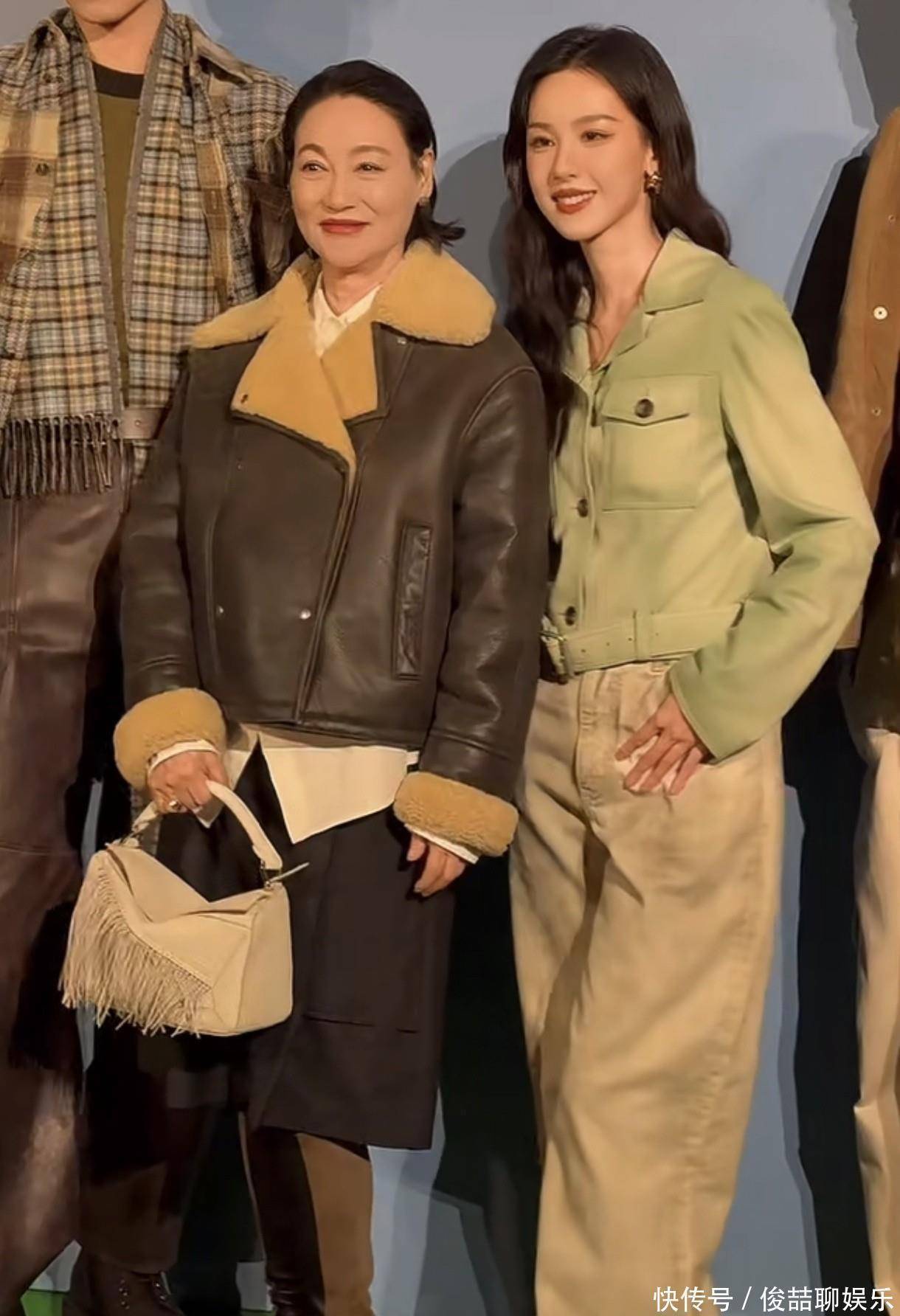 白色的衬衫搭配加绒皮质外套,时髦又保暖,还带着一点青春的气息,不仅时髦老太太们可以模仿她的穿搭,年轻小姑娘其实也可以借鉴一下,毕竟风度和温度也是可以兼顾的。而和她站在一起的陈都灵,就有点像是一个女儿了,光是这样看,两个人其实还挺像的。
